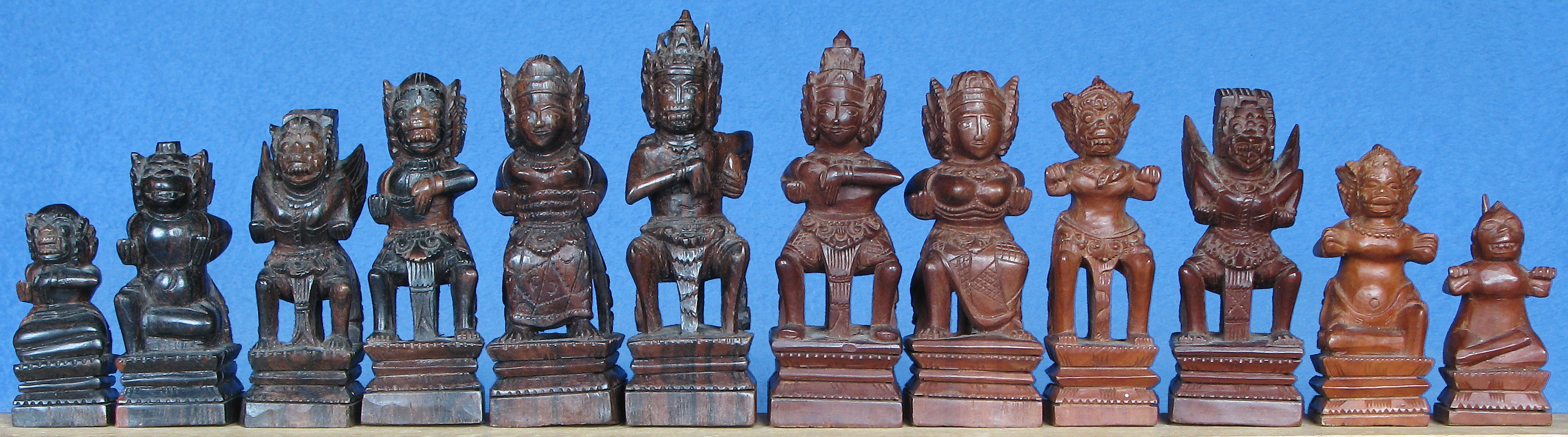 Indonesia. These are 8 Bali sets with a Ramayana theme. The King is Rama, in most sets sitting on the Garuda and the Queen is Sita. Bishop, Rook and pawns are the "Varana" (monkeys) or other mythological figures (in the 5th set is the Rook a Garuda). Knight could be Ravana (normally shown as man with multiple heads and arms?) The 1st set is, according Munger/III 2000, the old way to represent the Ramayana. I'm not 100% sure if the 5th set is representing the Ramayana.