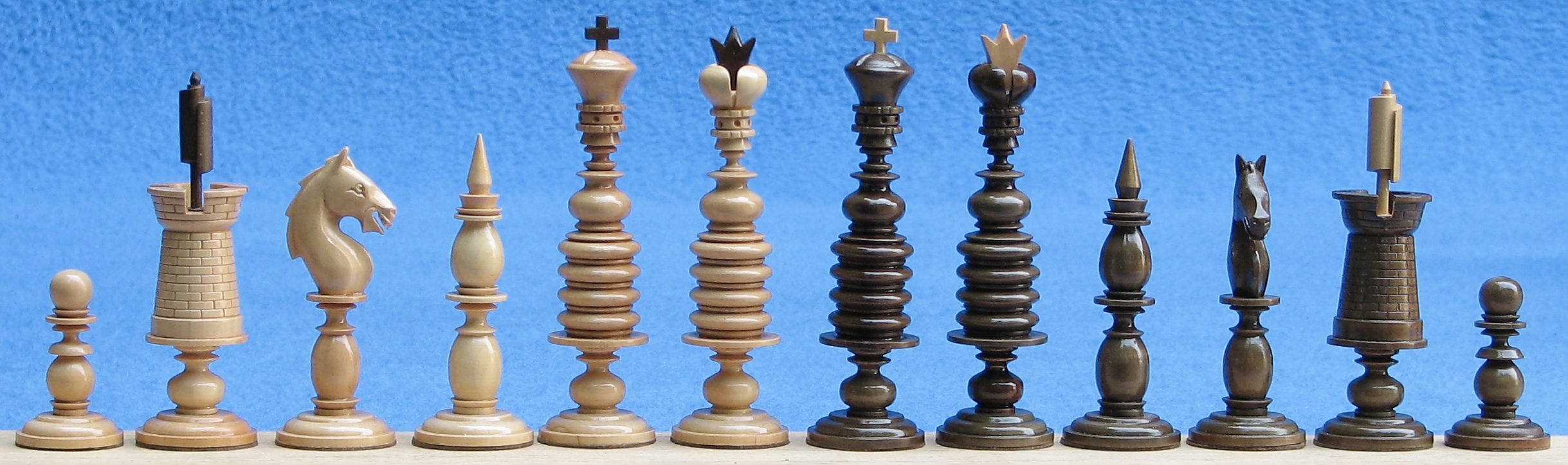 RU Russia, "Russian tournament" 1940ies-1950iesHippopotamus ivory K 8.3; p 4.5The set was sold to me as Russian, ca. 1920, sperm whale « ‹ of 4 › » Russia, "Russian tournament"ca. 1945Wood K 10.0; p 5.1 « ‹ of 3 › » Russia, by Carbolite company1940-1950Carbolite (russian bakelite) K 6.8; p 4.0 « ‹ of 6 › » Russia, Leningradca. 1955Plastic K 1.4; p 1.1Box 12.5×10.1×2.9Board 8.7×8.9 « ‹ of 4 › » Russia, "Russian tournament"Mid to late 20th centuryWood K 6.6; p 3.6Box/Board 34.0×17.2×4.9 « ‹ of 7 › » Russia, Moscow, Plastic-Products Industrial AssociationPresentation chess set in "Russian tournament" style1980Plastic K 10.0; p 5.1Cassette 35.4×35.9×3.7 « ‹ of 6 › » Russia, Divnogorsk in Siberiaca. 1980Carbolite+brass K 11.0; p 6.7Box/board 47.0×23.5×6.2 « ‹ of 2 › » Russia, "Chess souvenir"1980-1990Wood K 9.1; p 5.0Box/board 45.0×23.0×5.9Original cover « ‹ of 11 › » Russia, Gzhel, "Souvenir"1986Porcelain K 7.2; p 4.3Board 31.8×31.3×4.1 « ‹ of 5 › » Russia, Moskou - Gardner Verbilky1986Porcelain K 8.9; p 7.6Board 43.6×38.0 « ‹ of 5 › » Russia, "Russian tournament", politic faces1987Wood K 7.4; p 4.4 « ‹ of 4 › » Russia, "Matrioska"1997Birch K 10.8; p 5.8 « ‹ of 3 › » Russia, Moscow, by Chess Sets Gallery, "Barleycorn"2005Pear K 13.0; p 5.2Cassette/board 45.5×45.5×7.3Design by Oleg Raikis, inspired by the Barleycorn type « ‹ of 3 › »